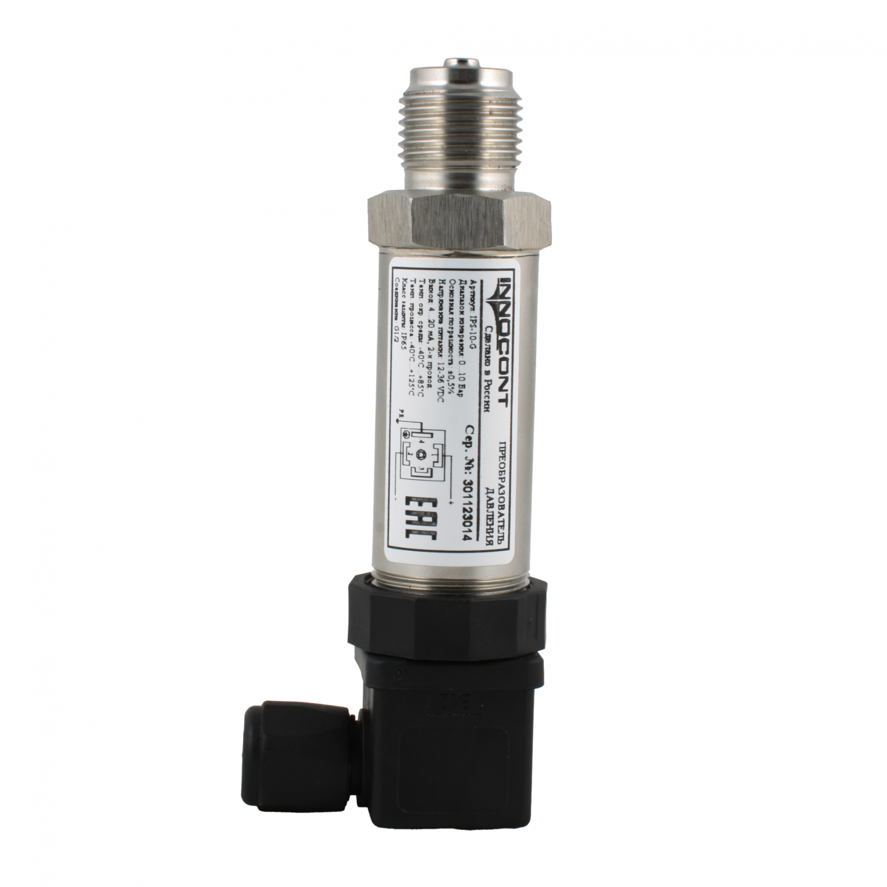 Преобразователь давления INNOCONT IPS-6-M, диапазон 0...6 бар, точность 0,5%, -40 +125 С, 12-36 VDC, IP65, разъем DIN